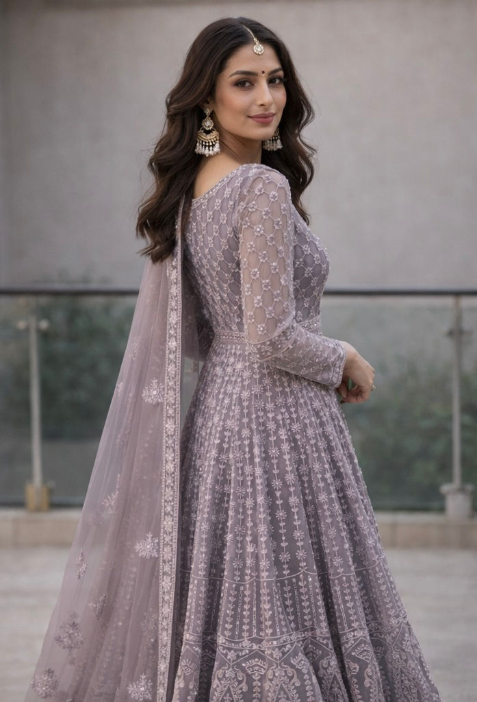 Dusty Lavender Embroidered Anarkali Gown with Dupatta