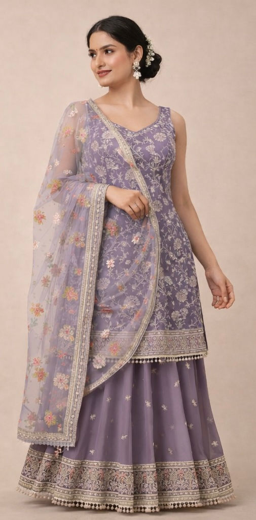 Lavender Embroidered Kurti Lehenga Set with Pastel Dupatta