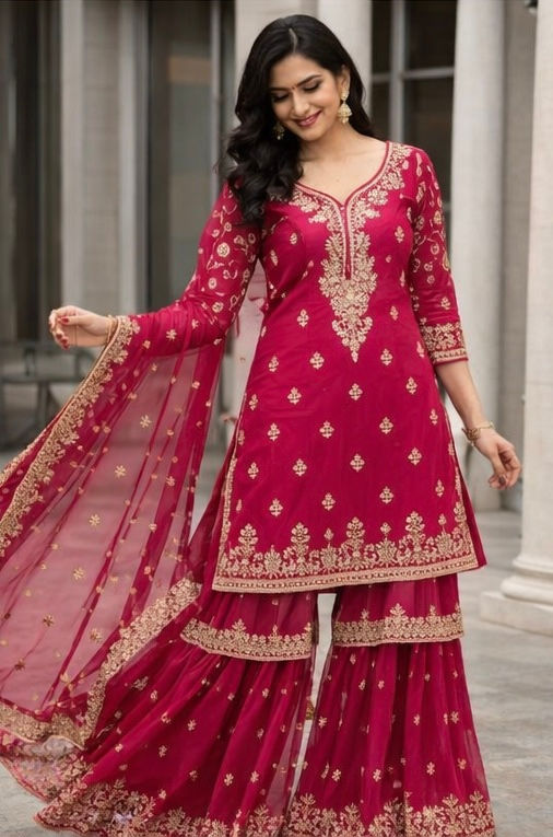 Elegant Purple Embroidered Kurti with Red Pants – Festive & Occasion Wear Set